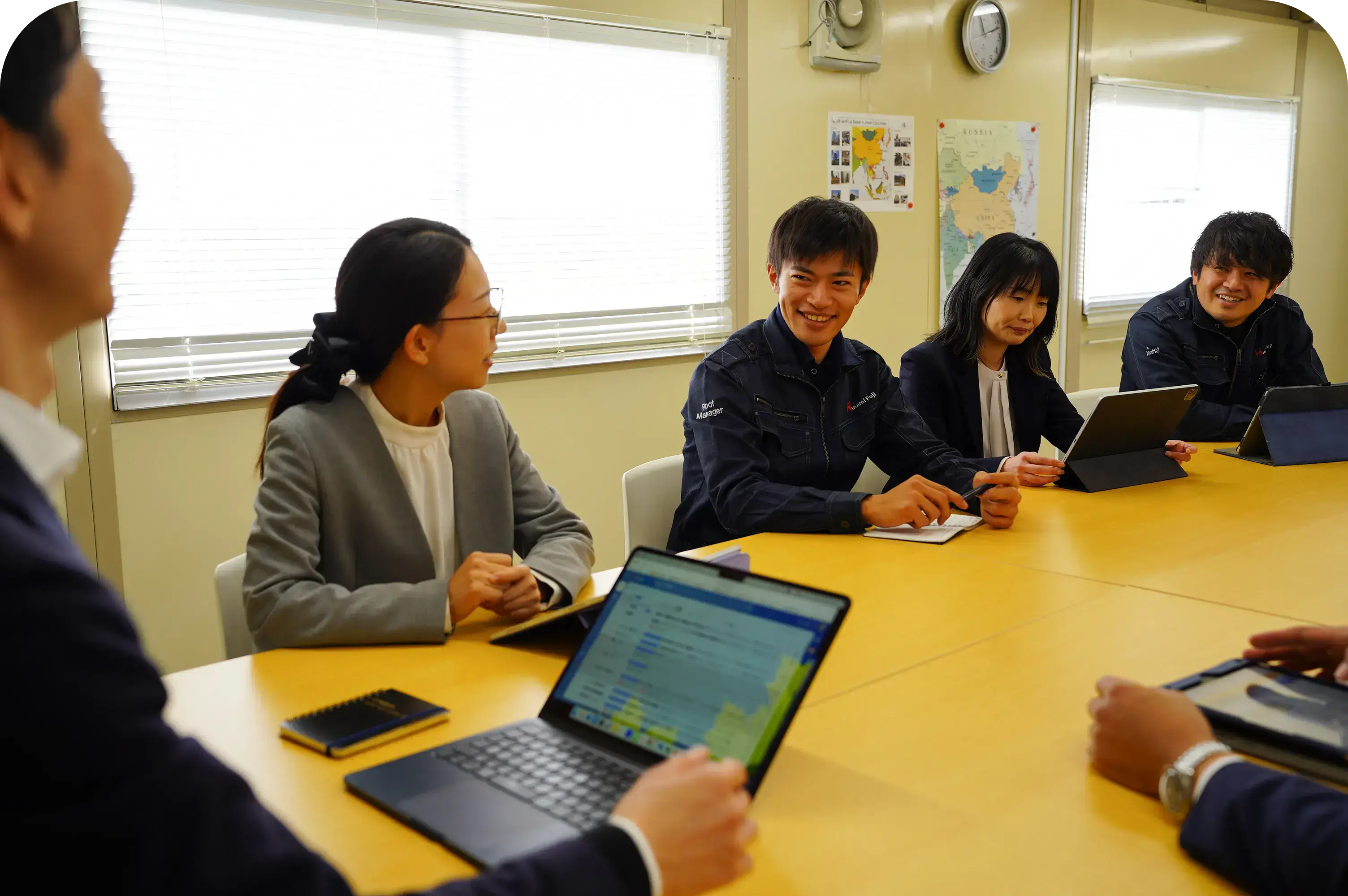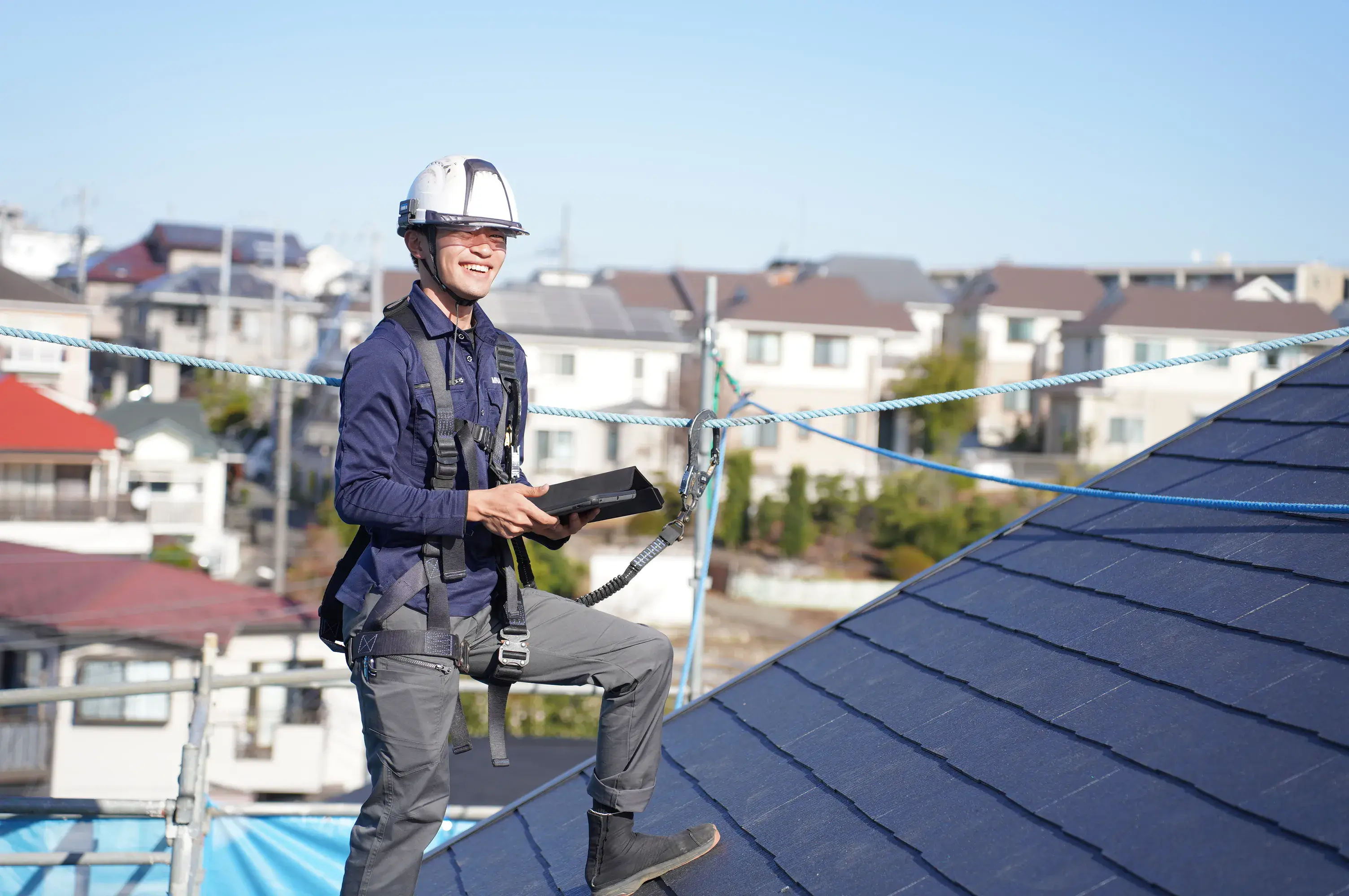 デジタル化の時代にアナログだが、ロボットでの屋根工事は難しく、人でなくてはできない屋根工事業。そんな中でも施工管理の社員は全てiPad携帯し業務フローはデジタル化を行いつつ、現代に適した屋根工事の仕組化を行っています。