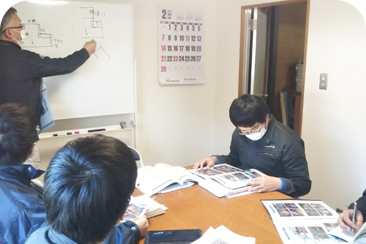 体力や施工技術は、毎日通い努力を続けることで自然と身についていきます。 そこで研修期間はそれぞれの苦手を克服すること、相手を敬うこと、自分に自信をつけること、コミュニケーションをとること、自分で考えて行動することなど、社会に出る上で必要なことを学ぶ環境をつくっています。